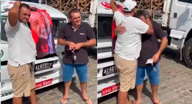 Em seguida, ele entrega o documento e a chave do caminhão ao colega Hamilcar Dias Junior, que perdeu a aposta. Os dois choram e se abraçam no momento da devolução.