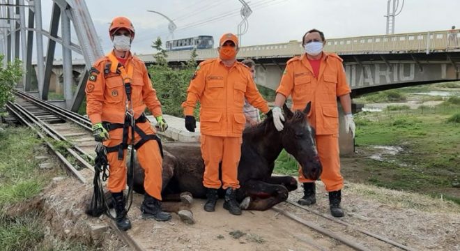Um cavalo ficou preso por uma das patas nos trilhos da antiga ponte ferroviária sobre o rio Jaguaribe, em Iguatu, na região Centro-sul do Ceará, e precisou ser resgatado por uma equipe do 4º Batalhão do Corpo de Bombeiros de Iguatu, nesta quinta-feira (24).