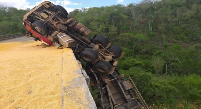 Na tarde desta terça-feira (18), uma carreta carregada de milho tombou na Rodovia SE-179, sobre a ponte sobre o Rio Vaza Barris, entre os municípios de Simão Dias e Pinhão. A rodovia está em meia pista.