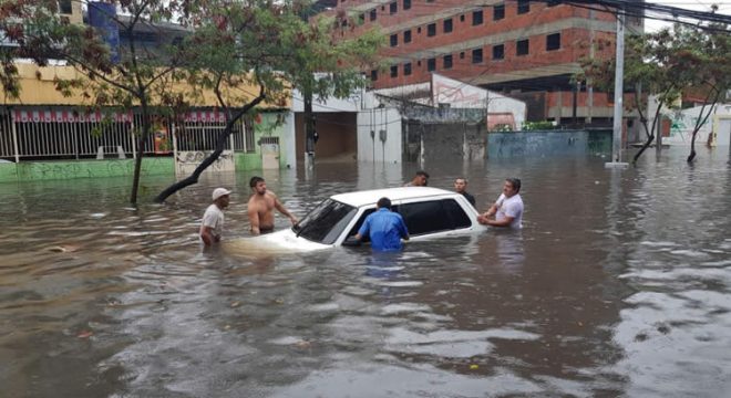 Após as precipitações, a água acumulada na Avenida Heráclito Graça, no Centro, deixou um automóvel, submerso nesta manhã. Outros três veículos e uma caminhonete ficaram também submersos. Moradores tentam levar um dos veículos para um lugar seguro.
