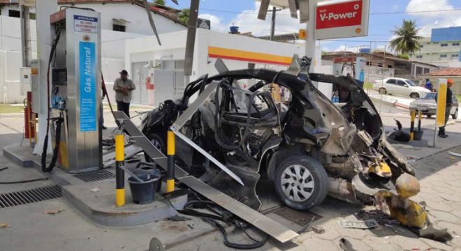 Cilindro de gás explode e carro fica destruído em posto de combustível