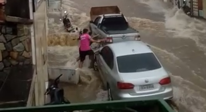 Imagens registradas por um morador da rua José Siqueira mostra a correnteza na via, surgida com a enxurrada. Com a força da água, um carro que estava estacionado começa a descer pela rua e só para com ajuda de populares e após colidir com um automóvel que estava logo atrás.