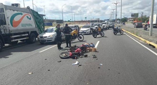 Um motociclista fugiu de uma blitz da Polícia Militar e invadiu a contramão da Avenida Senador Carlos Jereissati, no Bairro Serrinha, em Fortaleza, na manhã desta sexta-feira (24). Em alta velocidade, na contramão, ele colidiu em dois veículos e ficou gravemente ferido.