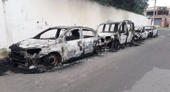 Quatro veículos que estavam estacionados próximo à Delegacia Municipal de Boa Viagem, cidade a 220 km de Fortaleza, foram incendiados na madrugada desta quinta-feira (27).