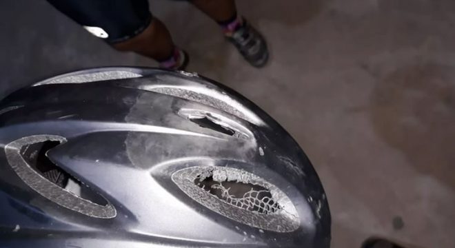 O capacete que o ciclista usava e parte da bicicleta dele ficaram danificados.