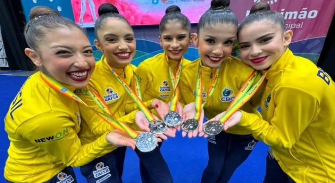 O conjunto brasileiro de ginástica rítmica conseguiu um resultado histórico neste sábado (11), na etapa da Copa do Mundo de Portimão, em Portugal. O quinteto do Brasil, formado por Maria Eduarda Arakaki, Victoria Borges, Deborah Medrado, Sofia Madeira e Nicole Pircio, conquistou a medalha de prata na prova do conjunto geral, após alcançar a pontuação de 68.850. A Espanha foi campeã com 70.300 pontos e o bronze foi para a França, com 65.050.