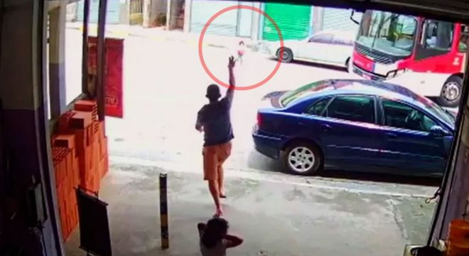 O pai da criança, não percebe e carrega uma caixa d’água, após alguns segundos a meninda tenta voltar, quando é atingida pelo ônibus.