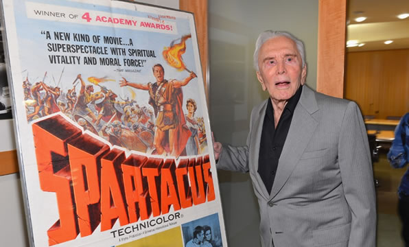 Kirk Douglas diante do cartaz do seu filme mais famoso, "Spartacus", de 1960 (AFP)