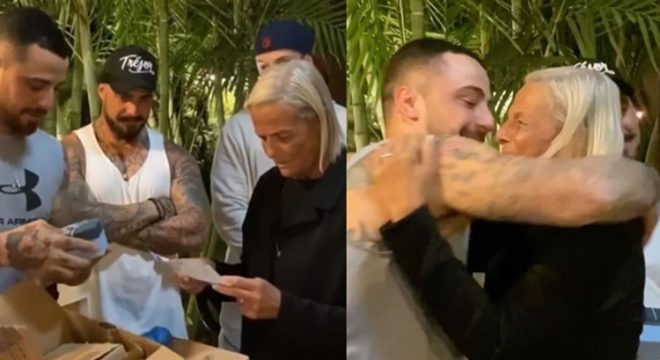 A surpresa foi bem planejada: o ator embalou diversas caixas, uma dentro da outra, para que a mãe fosse abrindo uma por vez. Na última, havia a chave do imóvel e uma carta, que foi lida pelo filho.