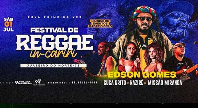 Neste sábado (1) acontece o 1° Festival Raggae in Cariri. O evento ocorrerá no Parque de Eventos Padre Cícero e contará com shows das bandas Nazirê, Missão Miranda, além de Guto Brito. Os amantes do gênero ainda poderão curtir a apresentação da atração principal da noite, o cantor Edson Gomes.