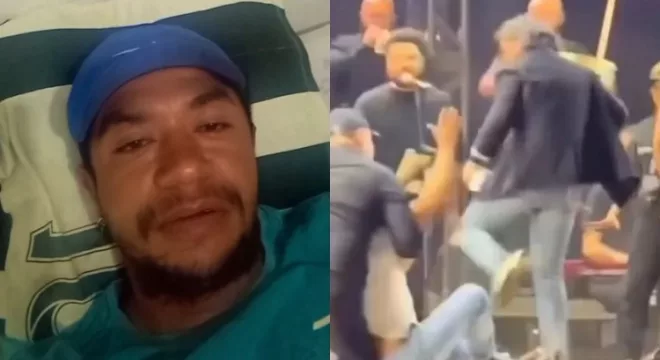 Segundo ele, além do chute da cantora, foi enforcado e agredido por um segurança. “O segurança me enforcou, me levou lá pra trás, me deu um chute”, relatou.