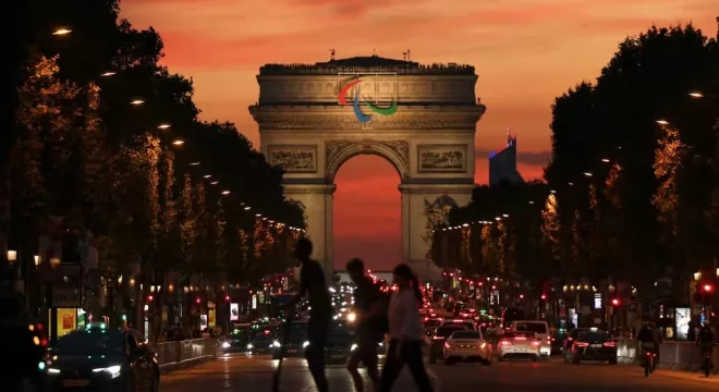 Champs-Elysées, com o Arco do Triunfo e o símbolo das Paralimpíadas ao fundo — Foto: REUTERS/Tingshu Wang