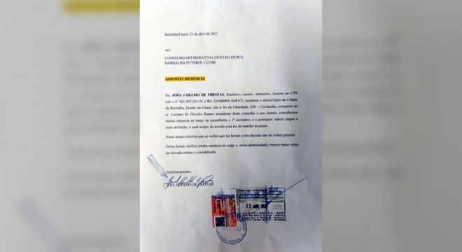 Carta renúncia do 1° secretário do conselho deliberativo do clube, Joel Freitas. (Foto: Reprodução)
