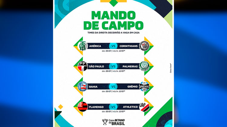 As quartas de final da Copa do Brasil têm como destaque o Choque-Rei, como é conhecido o clássico entre São Paulo e Palmeiras. O sorteio dos confrontos e do chaveamento da competição até a decisão do título ocorreu nesta terça-feira (6), na sede da Confederação Brasileira de Futebol (CBF), no Rio de Janeiro. As partidas de ida e volta estão previstas para as duas primeiras semanas de julho. As datas e os horários ainda serão anunciados.