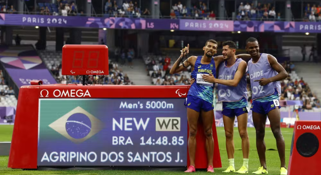 O Brasil conquistou mais um ouro nas Paralimpíadas de Paris. Nesta sexta-feira (30), Julio Cesar foi campeão dos 5000m da classe T11. Como se não bastasse o título, Julio ainda bateu o recorde mundial, somando incríveis 14min48s85. O Brasil também conseguiu uma dobradinha no pódio, com Yeltsin Jacques levando o bronze.