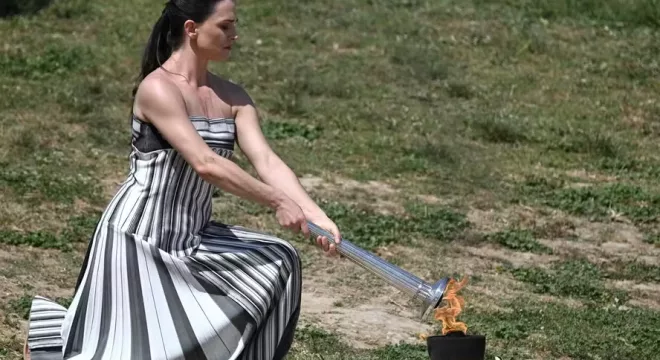 A chama olímpica foi acesa nesta terça-feira (16), em uma cerimônia no Templo de Hera, em Olímpia, palco dos Jogos na Antiguidade, na Grécia.