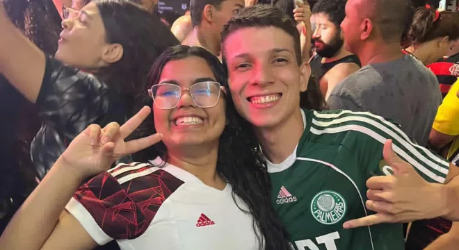 A reportagem do Replay com Toni Sousa encontrou o casal, Kauane e Renan. Apesar de ser gremista, Renan foi assistir ao jogo com a camisa do Palmeiras e teve que curtir a festa rubro-negra, ao lado da esposa. Veja no vídeo.