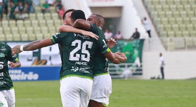 Jogadores comemoram gol do zagueiro Ramon (Foto: Heron Targino)