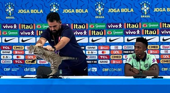 Na ultima quarta-feira (7/12), o gato “invadiu” a coletiva da seleção. A presença inusitada do bichano na mesa de entrevistas roubou as atenções e os holofotes. No entanto, a forma como a assessoria da CBF despertou indignação pelas redes sociais. Durante a “expulsão”, o animal foi segurado pelas costas e jogado ao chão.