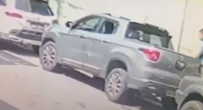 A bolsa estava no banco traseiro do carro e o suspeito conseguiu pegar o objeto abrindo a janela do veículo. As imagens mostram o momento em que ele tira a bolsa do carro pela janela e sai do local com o objeto nas mãos.