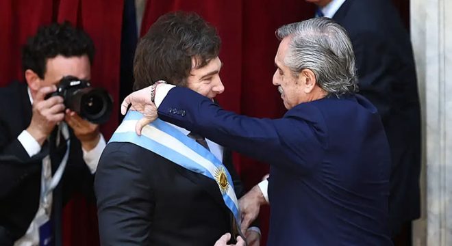 Já no Congresso, ele foi saudado sob gritos de “Liberdade”, antes de fazer o juramento de seguir a Constituição e receber o bastão e a faixa presidencial do ex-presidente Alberto Fernández. Em seguida, Milei posou para fotos e acenou para apoiadores, mas não discursou.