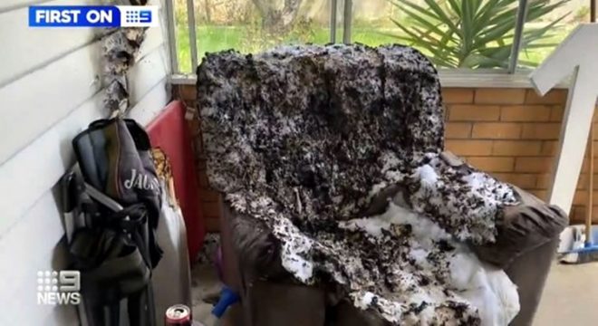 Poltrona destruída em incêndio provocado por moradora; marido morreu (Reprodução/Channel 9)