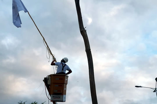 Bandeira de Santo Antônio em Barbalha foi hasteada com ajuda de um caminhão munck. (Foto: Normando Sóracles/ AgênciaMiséria)