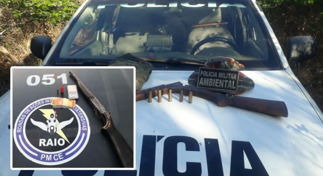 Antes, militares da Polícia Ambiental estiveram no Sítio Guritiba na zona rural de Santana do Cariri já próximo da área da Floresta Nacional do Araripe, onde abordaram um homem identificado apenas como “Argemiro” que pilota uma moto Honda Fan. Com ele os policiais encontraram uma espingarda calibre 28, um cartucho intacto e outro deflagrado, além de diversos materiais para caça. O mesmo foi apresentado na Delegacia de Crato para os devidos procedimentos.