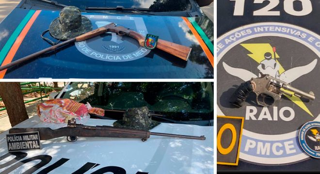 Revólver apreendido em Aurora e as espingardas recolhidas em Missão Velha e Juazeiro. Fotos: Reproduções/PM