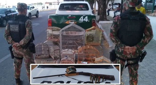 Aves apreendidas em Juazeiro e a espingarda recolhida em Farias Brito (Foto: Reprodução)