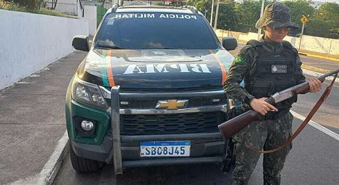 Soldada Bruna com espingarda apreendida em Tarrafas (Foto: Reprodução)