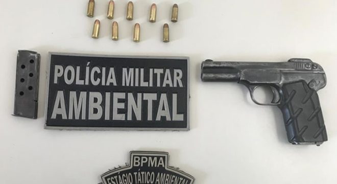 Um homem foi flagrado por policiais militares armado com uma pistola nesta quinta-feira. Por volta das 9 horas uma patrulha da Polícia do Meio Ambiente com o Subtenente Sobreira, o Sargento Felipe e o Soldado Ferreira promovia fiscalização na área do Sítio Guritiba na zona rural de Santana do Cariri, onde ocorreu o flagrante.