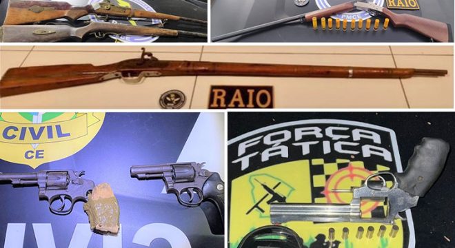 Quatro espingardas apreendidas em Aurora, além de dois revólveres em Juazeiro e outro em Barbalha (Foto: Reprodução)