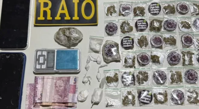 Durante a vistoria na residência, os policiais localizaram drogas sobre a geladeira e em outra mesa. No total, foram apreendidos seis papelotes de cocaína, somando 24 gramas, além de 48 papelotes de maconha, que totalizaram 97 gramas. Também foram recolhidos uma balança de precisão, material plástico utilizado para embalar drogas e a quantia de R$ 17.