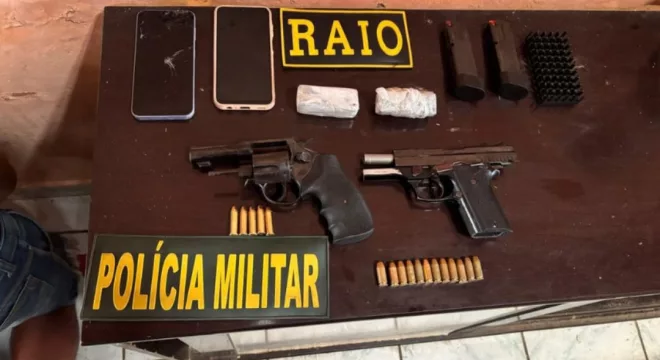 No local, os policiais foram recebidos por Carlos Manuel de Lima, de 23 anos, conhecido como “Cebolinha”. Thallis também estava na residência. Durante as buscas, os militares apreenderam uma pistola calibre .40, um revólver calibre .38, munições e aproximadamente 100 gramas de maconha.
