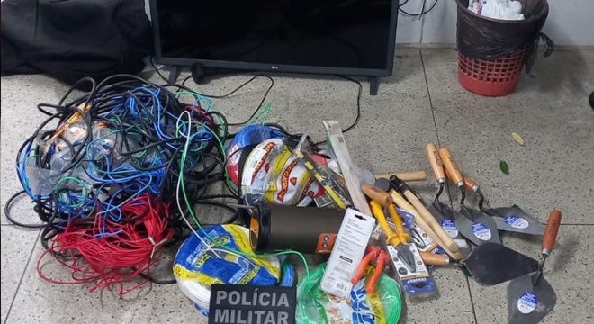 Além disso, o estabelecimento estava revirado quando os policiais descobriram o número do telefone do proprietário e o Tenente Oliveira, Oficial do Dia, manteve contato com o mesmo. Houve reforço policial com o apoio da Força Tática quando a dupla foi levada à presença do delegado Douglas Duremberg. Foram recuperadas a TV de 32 polegadas, seis colheres de pedreiro, caixa de som, quatro martelos, duas talhadeiras, três rolos de fio, um rolo de cabo, alicate, mangueira, arco de serra, chave de fenda, cadeado, cabos eletrônicos diversos, canivete e fonte de energia. John já responde por furto e lesão corporal, enquanto o seu comparsa responde por roubo.