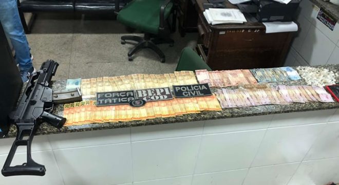 No local, também foram apreendidos aparelhos eletrônicos, sendo cinco câmeras de segurança, CPU, HD externo, celulares; além de um simulacro de fuzil, 108g de cocaína e R$ 1.870,00 em espécie.