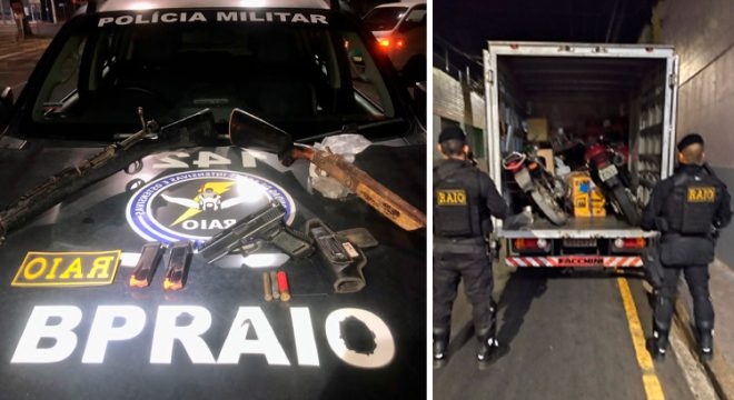 Eles foram averiguar já se deparando com uma moto no imóvel apresentando queixa de roubo. No aprofundamento das buscas encontraram diversas mercadorias oriundas de uma carga que tinha sido roubada de uma transportadora, além de espingarda calibre 12. De repente um homem ali chegou assumindo ser dono das coisas, mas os PMs não se deram por satisfeitos e foram até outro imóvel dele na Rua São Paulo encontrando mais mercadorias, um fuzil Mosquefal 762, dois carregadores e um simulacro de pistola.