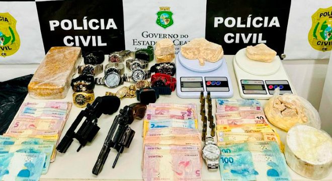 Durante a busca e apreensão no carro, foram encontrados crack, cocaína e uma quantia em dinheiro, o valor não foi informado. A busca seguiu nos endereços relacionados ao acusado, onde foram localizadas mais drogas, totalizando 2,2kg. A PCCE apreendeu, ainda, duas armas calibre 38, munições, celulares, cadernos de anotação, dois carros e uma motocicleta. Raphael Coelho de Oliveira Mendes foi autuado em flagrante por tráfico de drogas e posse irregular de arma de fogo.
