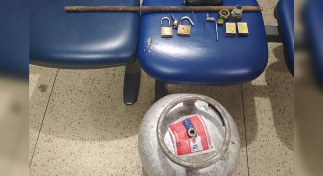Barra de ferro usada para quebrar cadeados do quiosque em Juazeiro e o botijão de gás recuperado pela Guarda Municipal. (Foto: Reprodução/Redes Sociais)
