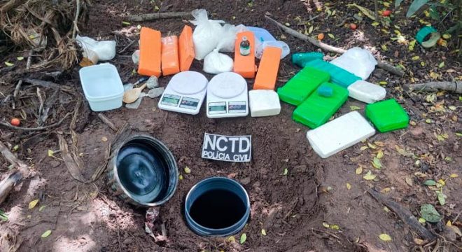 Além disso, sacos plásticos para embalar substâncias entorpecentes e rolos de fita. Conforme levantamentos policiais, dentro de uma casa abandonada nas imediações do terreno também foi localizada uma prensa utilizada para a preparação das drogas. Ao todo, foram apreendidos nove tabletes de maconha, oito de cocaína, dois de crack, uma quantidade de pó branco usado como insumo da cocaína e um frasco de cloridrato de cocaína, utilizado para a preparação da mesma droga.