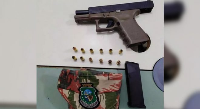 Polícia apreendeu pistola usada por idoso para tentar matar homem durante discussão em restaurante na Messejana. Mulher do suspeito foi baleada por ele ao tentar impedir crime.(Foto: Polícia Militar/ Divulgação)