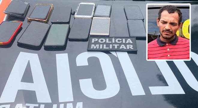 Jesus foi preso esta manhã em Juazeiro com uma moto roubada e a operação da PM resultou na apreensão de 13 celulares de origem duvidosa (Fotos: Reprodução)