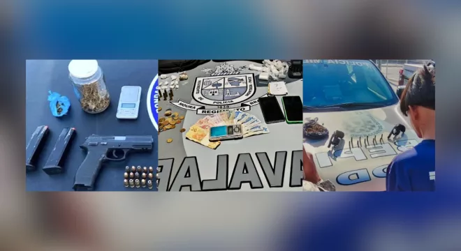 Ações da Polícia Militar no combate ao tráfico de drogas resultaram nas prisões de quatro pessoas, cinco armas de fogo e bastante entorpecentes no Cariri. Na Rua Raimunda do Socorro Lira Nobre (Brejo Seco) em Juazeiro militares do POG prenderam Kevynson Alencar da Silva, de 22 anos, por porte ilegal de arma de fogo. Ele mora no bairro Aeroporto e se refugiou num salão de beleza onde tentou esconder por trás de uma poltrona um revólver calibre 38 com cinco munições intactas.