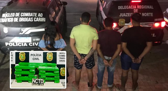 Nova ação de policiais civis do Núcleo de Combate ao Tráfico de Drogas (NCTD) do Cariri resultou na prisão de quatro homens e apreensão de 28 quilos de maconha no bairro Salesianos em Juazeiro do Norte. Foram presos Francisco Anderson de Lima, de 23, Nilson Ribeiro Batista, de 22, Demia Adgeane Ferreira Torres, de 34 e Emenson Sergio Martins Barroso, de 30 anos. O quarteto estava num carro dirigido por Anderson o qual foi interceptado pelos policiais que encontraram a droga no porta-malas.