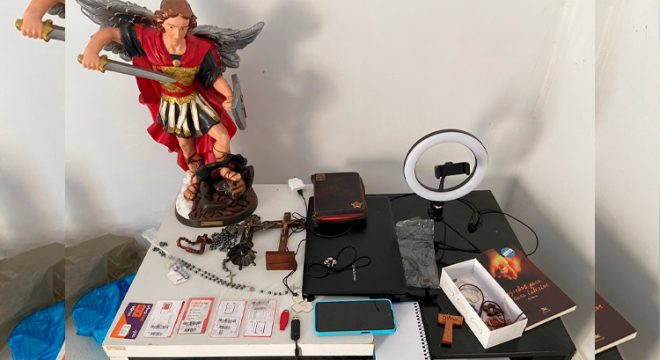 A partir da operação denominada de ‘Matheus 7:15’, a Polícia Civil cumpriu, além do mandado de prisão, um mandado de busca e apreensão. E, ao investigar a casa do jovem detido, encontrou aparelhos eletrônicos, imagens sacras, chips telefônicos e diversos materiais utilizados nos crimes que ocorriam no meio cibernético.