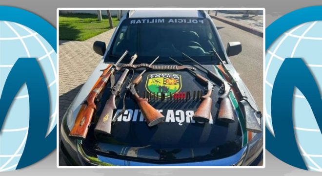 Durante as buscas, os policiais apreenderam três espingardas artesanais sem numeração aparente, outras três espingardas, sendo duas calibre 32 e uma calibre 36, além de 24 munições e um recipiente contendo pólvora.