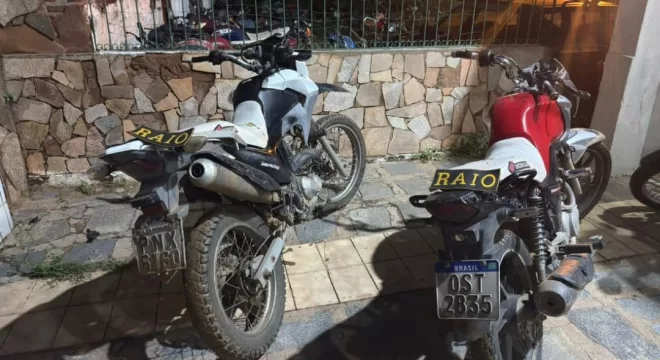 No local, foram encontradas duas motocicletas: uma Honda NXR Bros 160 branca, de placa PNX-6160, com registro de roubo, e uma Honda CG 160 Fan vermelha, de placa OST-2B35.