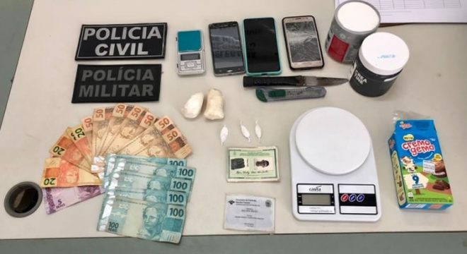 De acordo com a polícia militar, foram apreendidos 100 gramas de cocaína pronta para comercialização, 3 celulares, R$ 945,00, saquinhos de dindin para acondicionar a droga, balança de precisão e outros objetos.