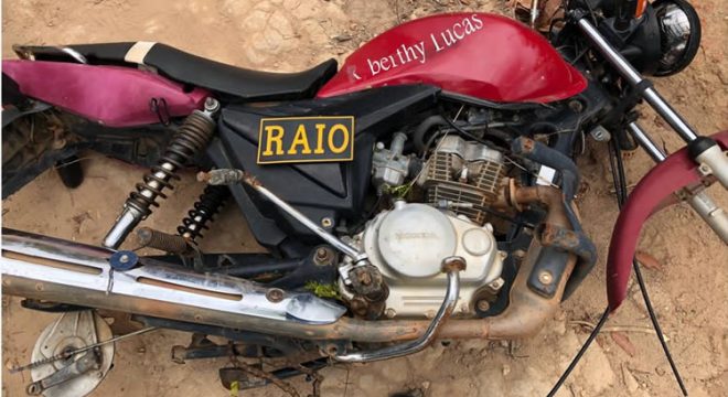 Moto tinha sido furtada em Crato e estava abandonada num matagal sem as rodas. (Foto: Reprodução/Redes Sociais)